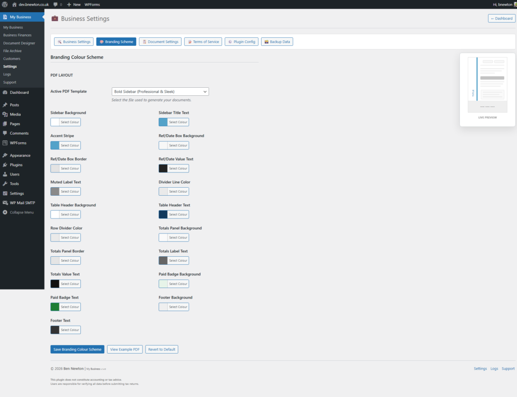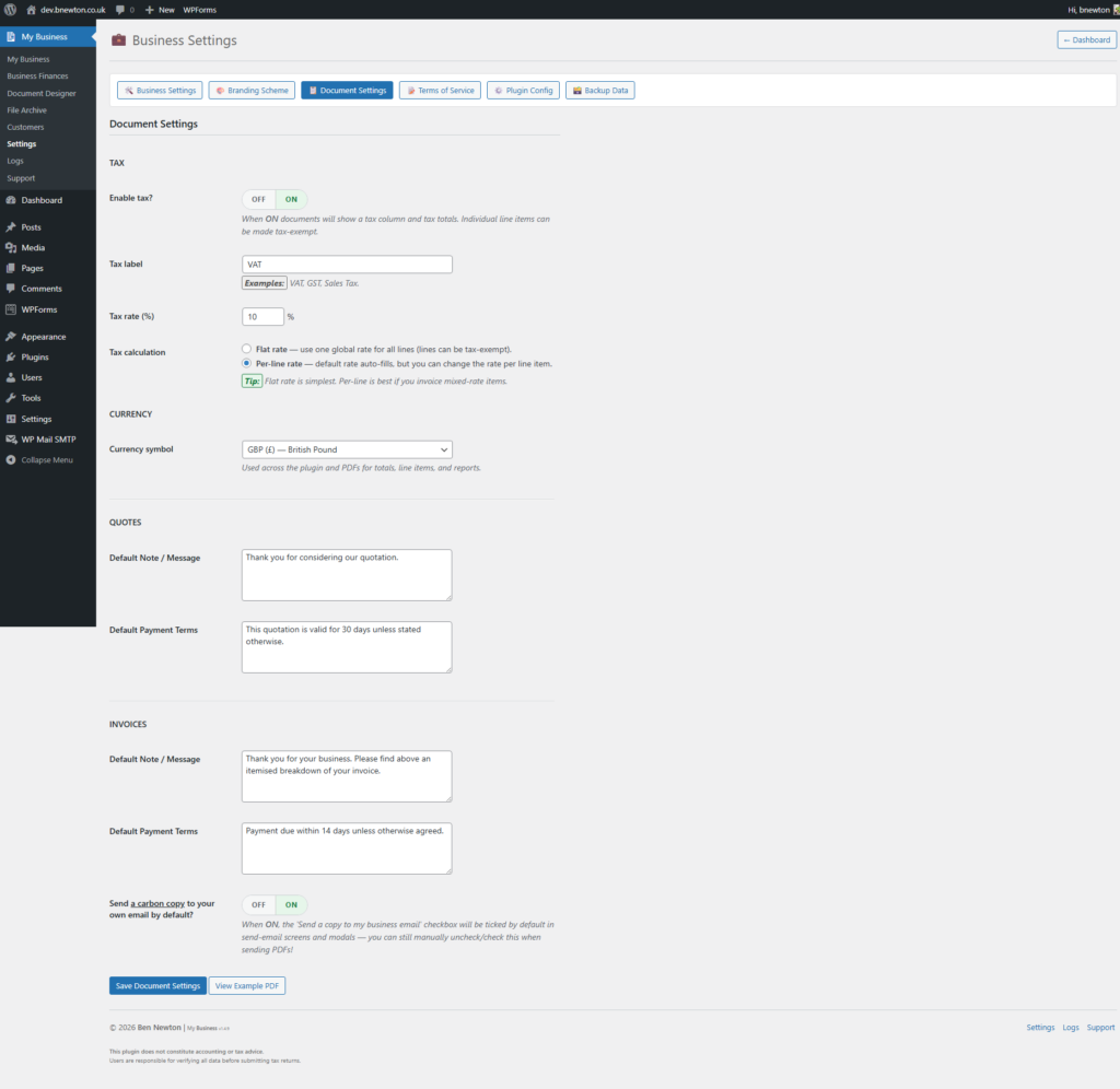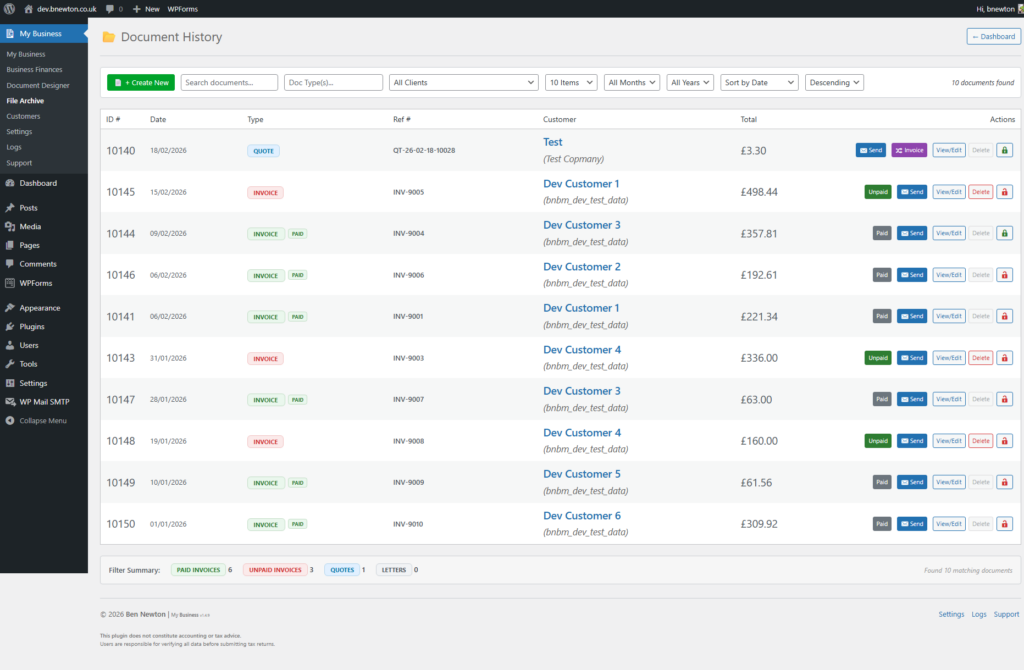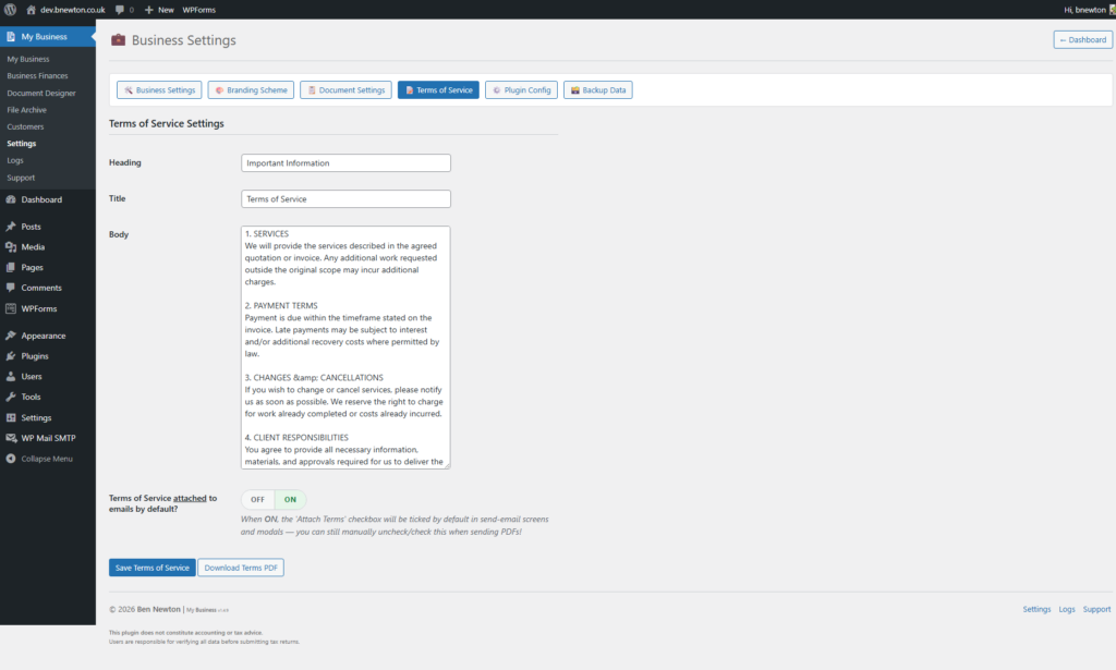 PDFs are generated on-demand whenever you view, download, or email a document. The underlying document data is securely stored in your WordPress database, and the PDF is created from that data only when required. This keeps your hosting storage clean and efficient.