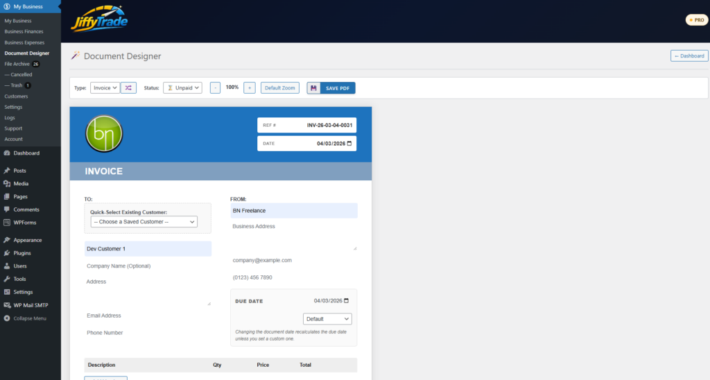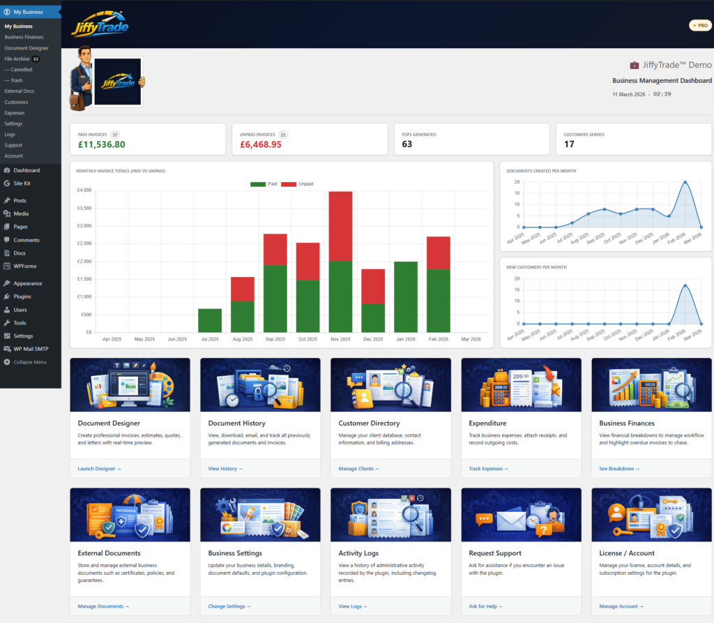 You do. All customer records, invoices, quotes, expenses, and documents are stored in your own WordPress database on your own website. JiffyTrade™ does not store or control your business data.